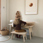 Mit einer großen Arbeitsplatte und dem passenden RIN Regal, das je nach Bedarf am hinteren Ende der Platte stehen oder an der Wand hängen kann, bietet FUYU ausreichend Platz und zusätzlichen Stauraum. Das schlichte Steckdesign und das helle Birkensperrholz aus nachhaltiger Forstwirtschaft fügt sich leicht in jedes Kinderzimmer ein. Der Hocker AKI ist die passende Sitzmöglichkeit.