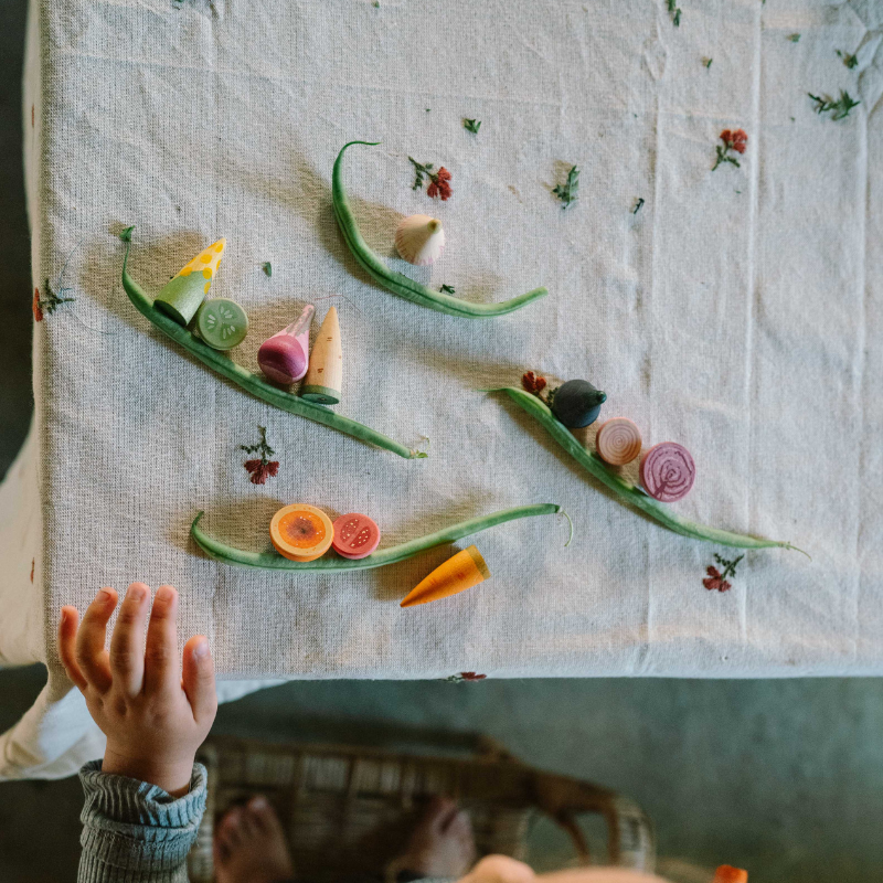Zeit für die Ernte – mit dem Veggies Set von Grapat bringen Kinder die frischeste Gartenfreude direkt in ihr Spielzimmer. Handbemaltes Holzgemüse wie knackige Karotten, pralle Tomaten und grüne Blätter lädt dazu ein, zu schneiden, zu sortieren, Mahlzeiten zuzubereiten und eigene Geschichten zu erfinden.