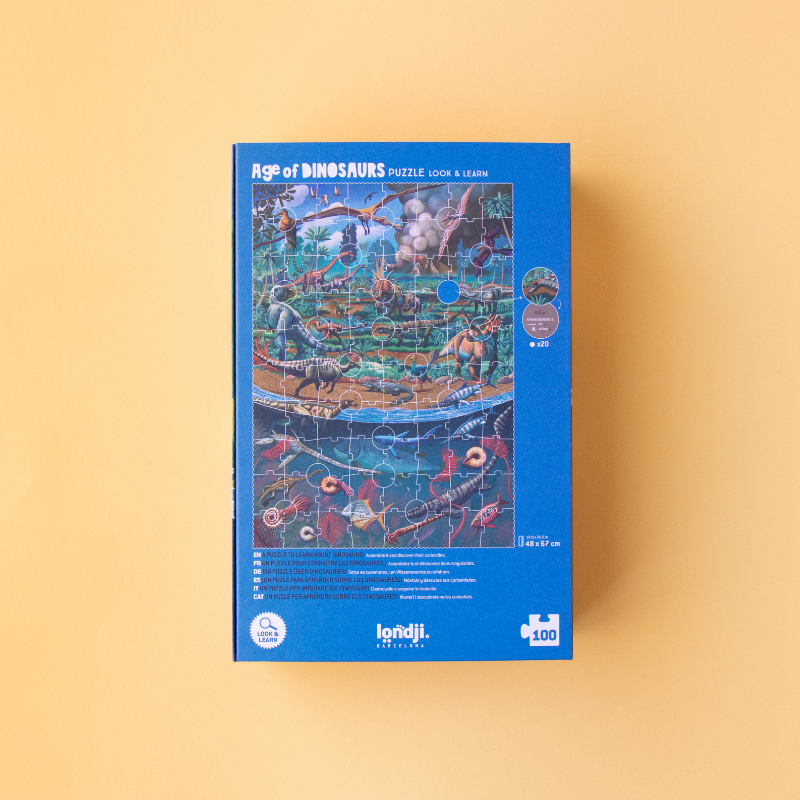 Ein Dinosaurierpuzzle mit 100 Teilen und ein Beobachtungsspiel, ein didaktisches Spielzeug, mit dem man spielerisch Wissenswertes über verschiedene Dinosaurier lernen kann!