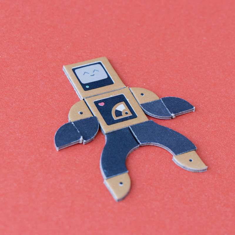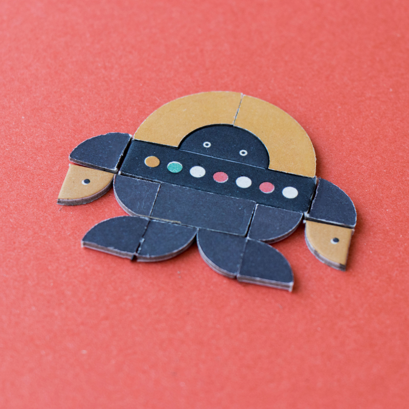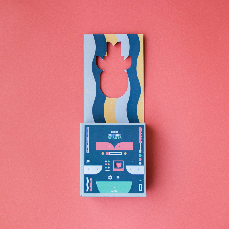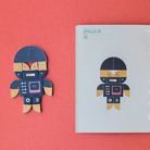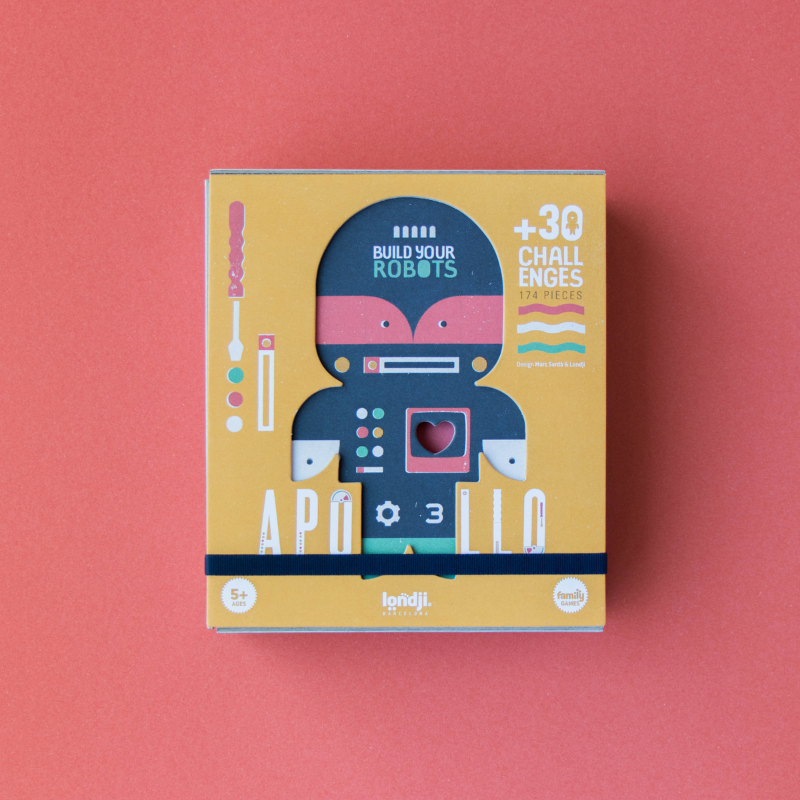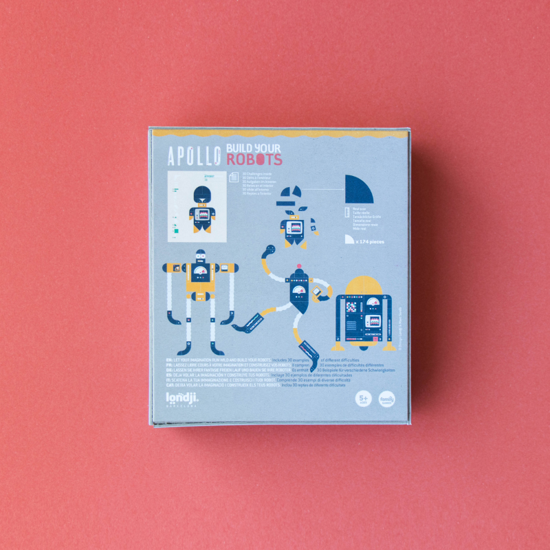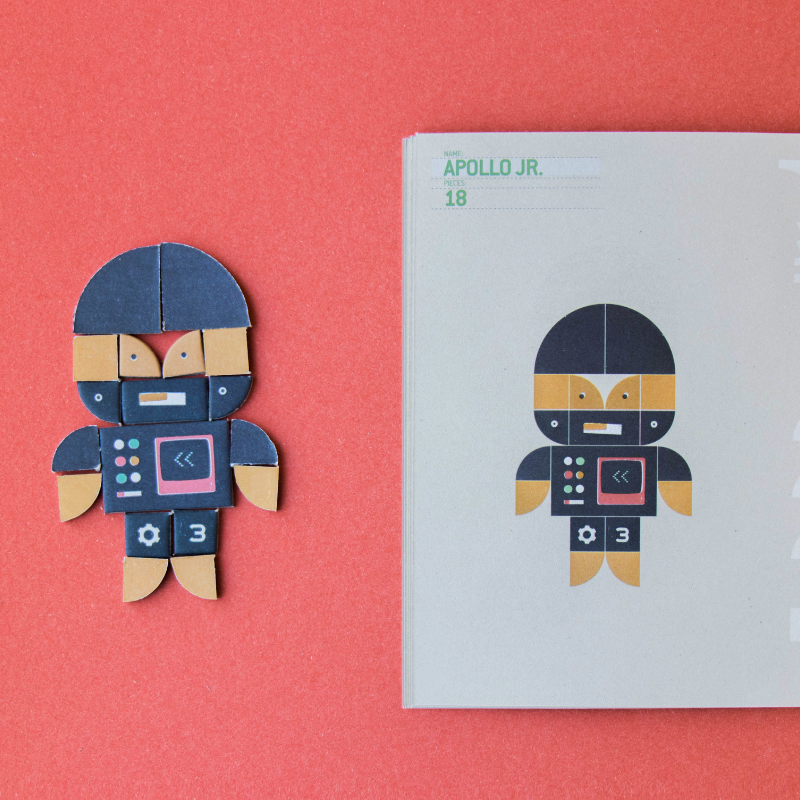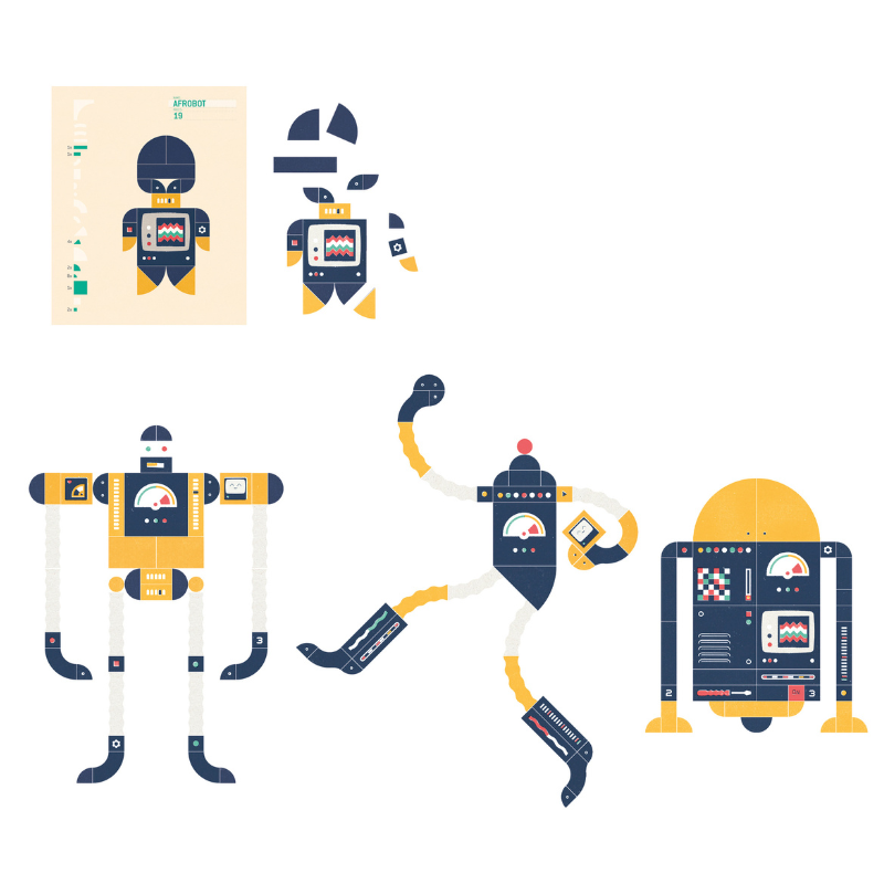 Figuren aus traditionellen Tangram-Steinen und Roboter zu bauen. Das Ergebnis: Ein Spiel, das aus mehreren Teilen besteht, die auf viele verschiedene Arten kombiniert und konfiguriert werden können, um eine unzählige Anzahl von Robotern zu erschaffen. Das Spiel beinhaltet neben 174 Holz- und Kartonteilen zum Zusammensetzen auch ein Buch mit einigen Beispielen von Robotern, die Sie als Ausgangspunkt verwenden können.
