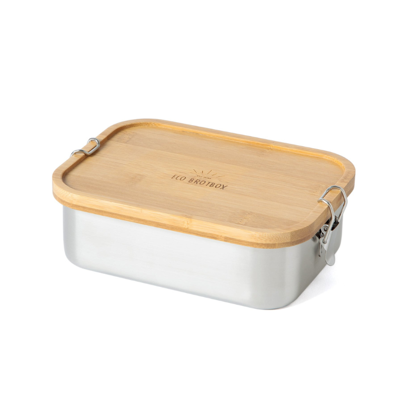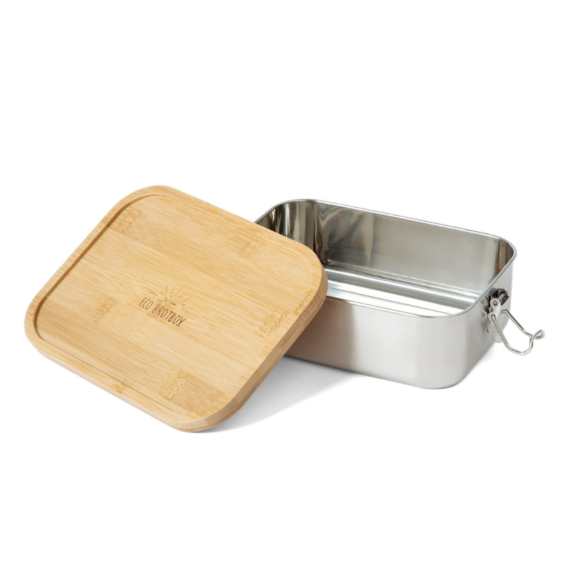 Die Edelstahl Brotdose mit Bambusdeckel ist perfekt für Schule oder Kindergarten. Auch bei Ausflügen oder im Büro ist das Pausenbrot oder die Mahlzeit auslaufsicher verpackt. Die Brotdose mit Bambusdeckel ist groß genug für ein belegtes Brot oder Brötchen.