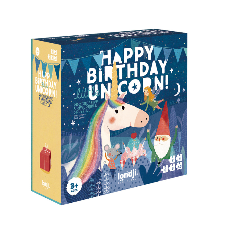 Wunderschönes Puzzle Happy Birthday Unicorn! von Londji aus Spanien, bestehend aus fünf kleinen Puzzles die beidseitig bespielbar sind, für Kinder ab 3 Jahre. Feier eine tolle Geburtstagsparty als Gast bei einer Einhornparty! Die Puzzleteile werden in einem umweltschonenden Jutebeutel geliefert.