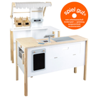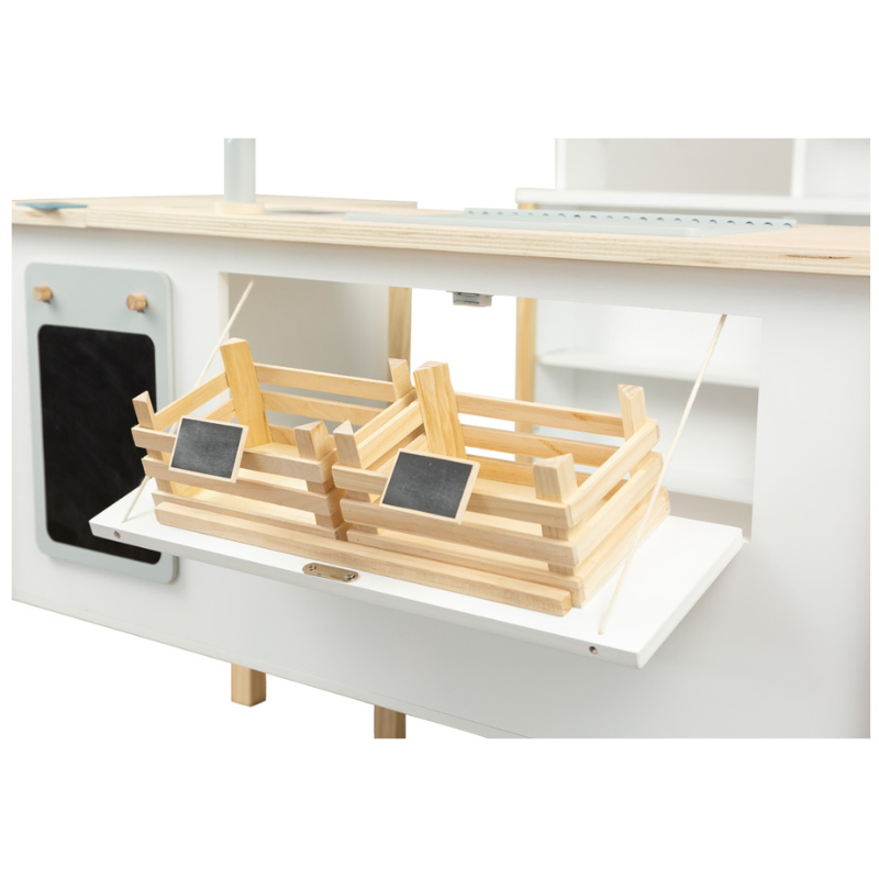 Ein echtes Highlight für kleine Nachwuchsköch:innen und Kaufleute! Dieses wandelbare Spielmöbel vereint Kaufladen, Kinderküche, Marktstand, Imbiss und Café in einem und lässt keine Wünsche offen. Dank des modularen Designs lassen sich die Elemente flexibel anordnen – perfekt, damit mehrere Kinder gleichzeitig spielen, handeln und kochen können.