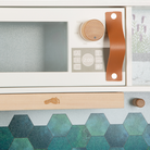 - stabil konstruierte, moderne Kinderküche in warmem Grau kombiniert mit cognacfarbenen Kunstledergriffen