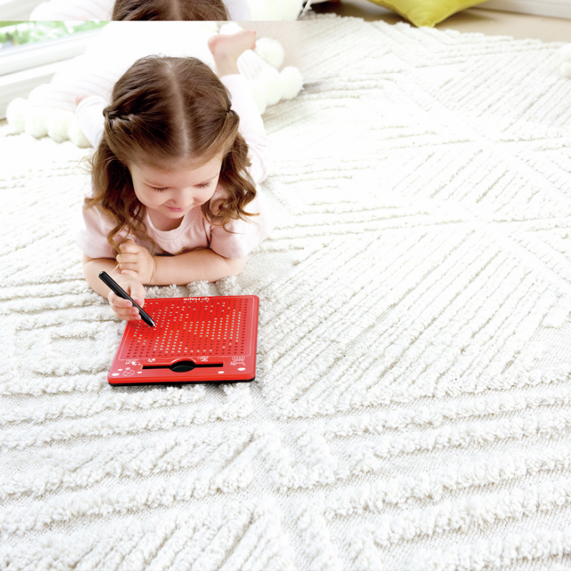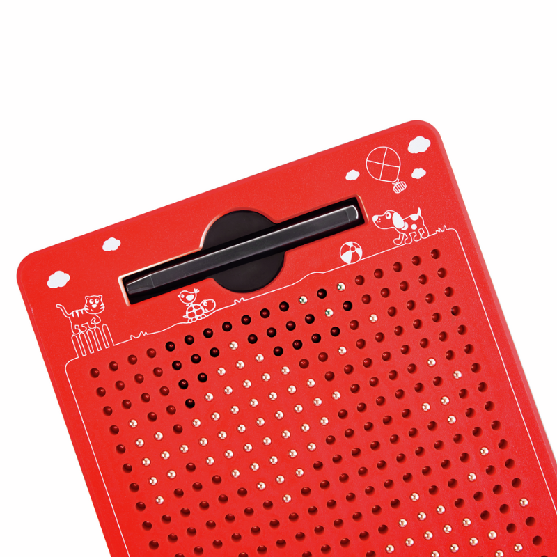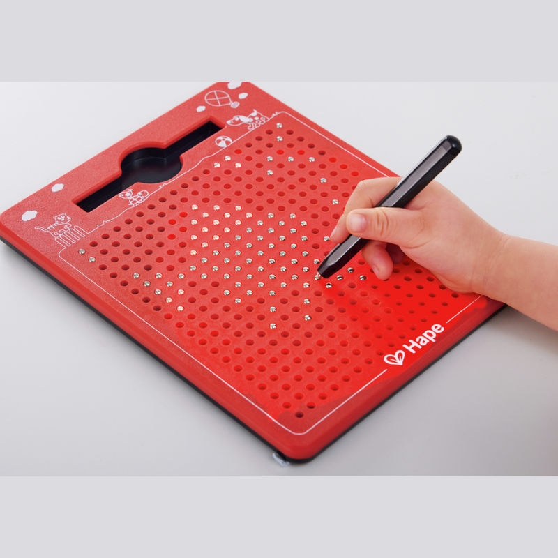 Die kleine Magnettafel von Hape ist ein kreatives Lernspielzeug, das Kinder ab 3 Jahren spielerisch in ihrer Entwicklung begleitet. Mit dem Magnetstift lassen sich die Kugeln an die Oberfläche heben – so entstehen Muster, Formen oder erste Buchstaben. Ganz nebenbei werden Feinmotorik, Geduld und Konzentration gefördert.