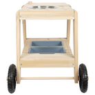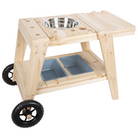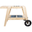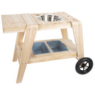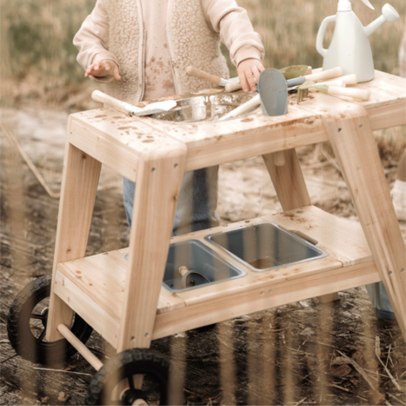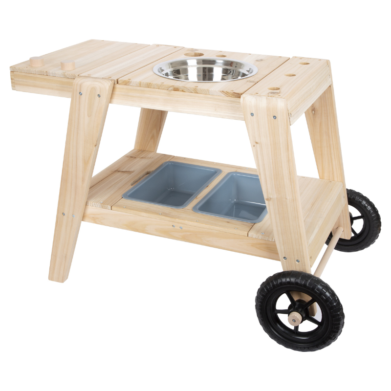 Mit an Bord: eine robuste Metallschüssel zum Matschen, zwei herausnehmbare Kunststoffwannen, eine Arbeitsfläche mit Drehknöpfen und sogar Rollen für den einfachen Standortwechsel. Und das Beste: Sie ist von allen Seiten bespielbar und steht dank ausgestellter Beine sicher – auch wenn’s mal wilder zugeht.