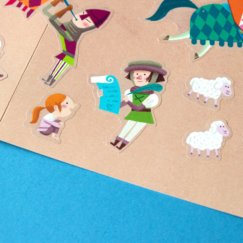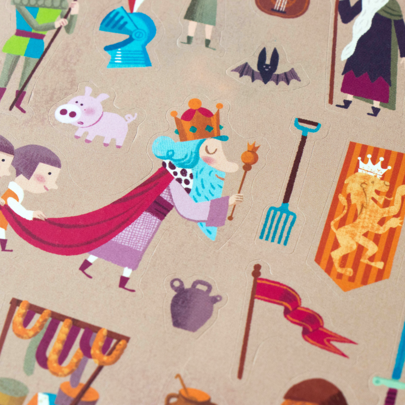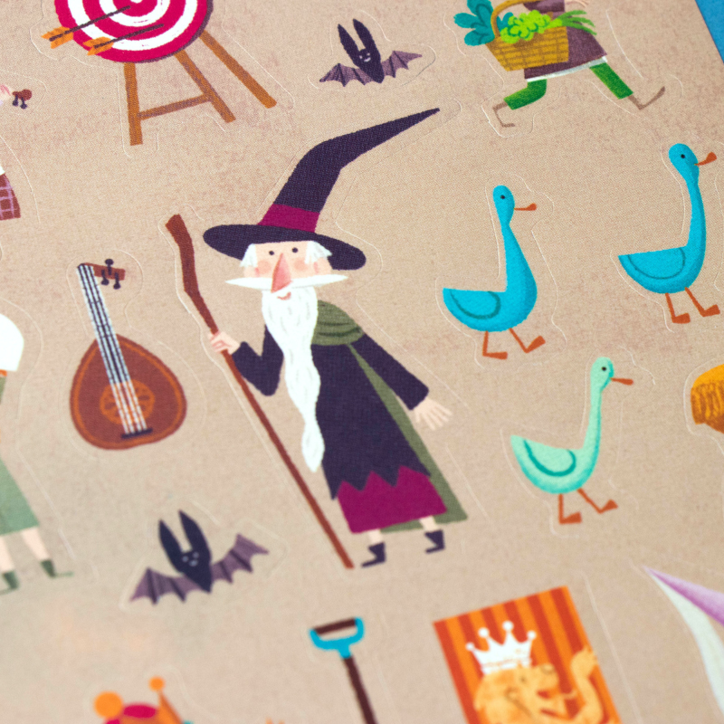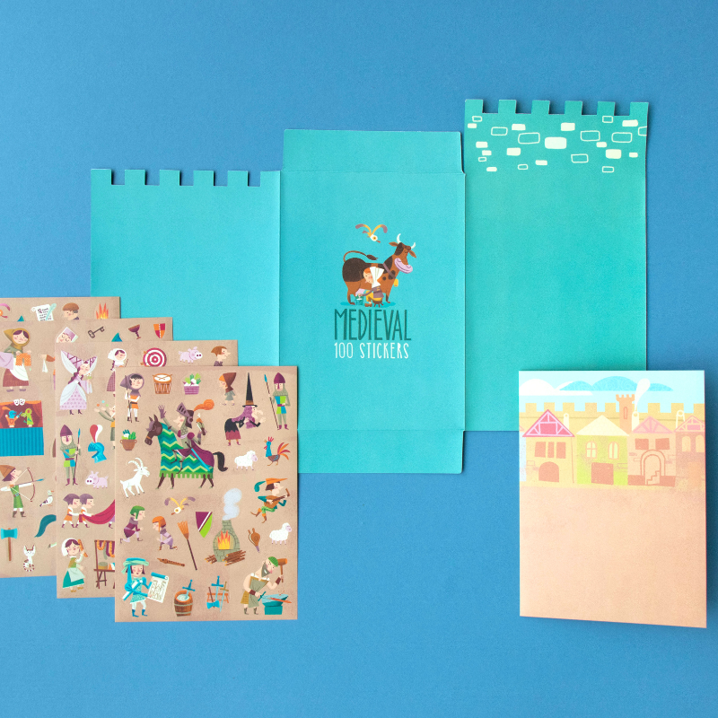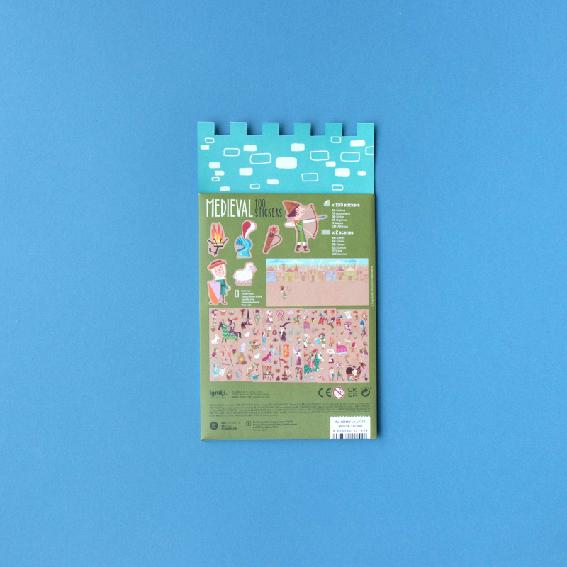 150 tolle, wieder ablösbare Aufkleber "Medieval" von londji aus Spanien. Die verschiedenen Motive zeigen lustige Illustrationen der Ritterwelt. Die Verpackung der Sticker ist auch gleich eine tolle Ritterburg zum bekleben!