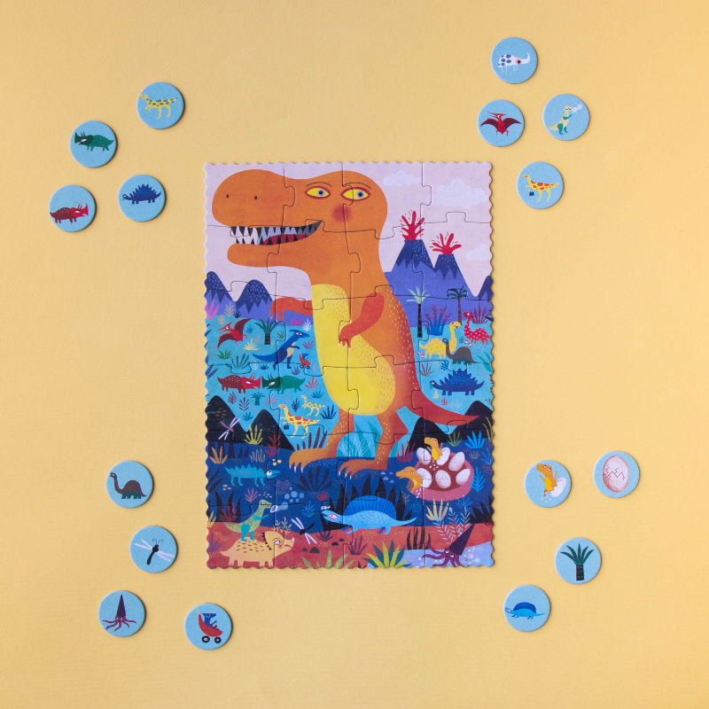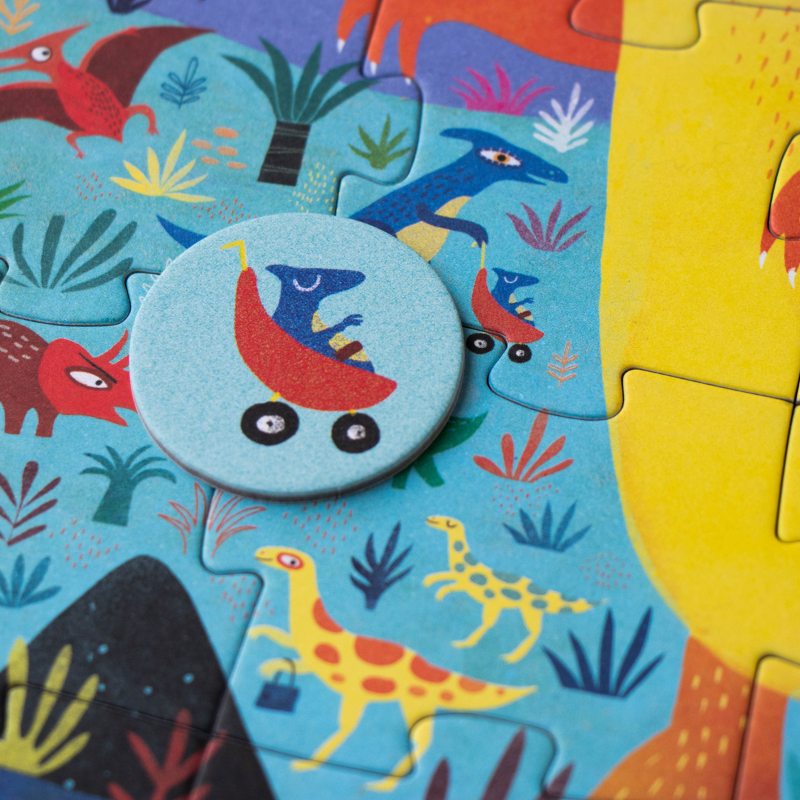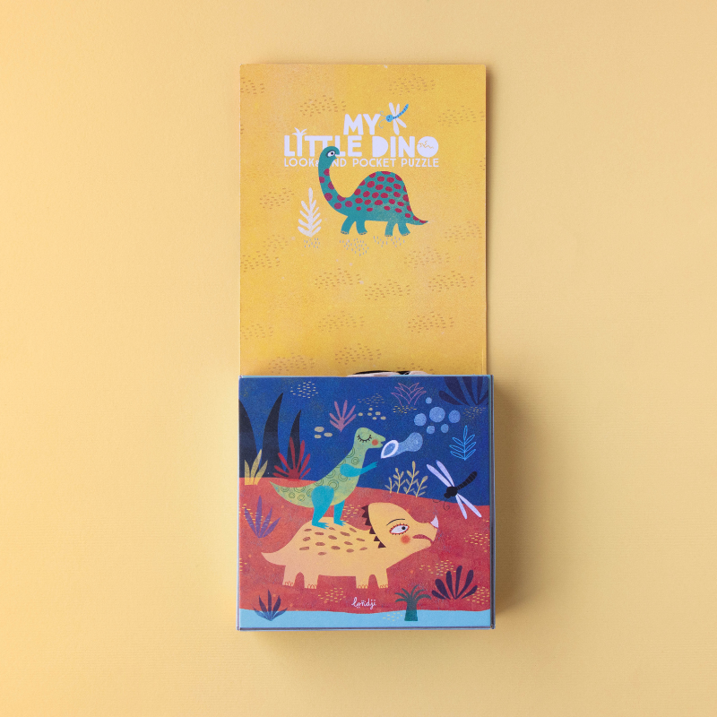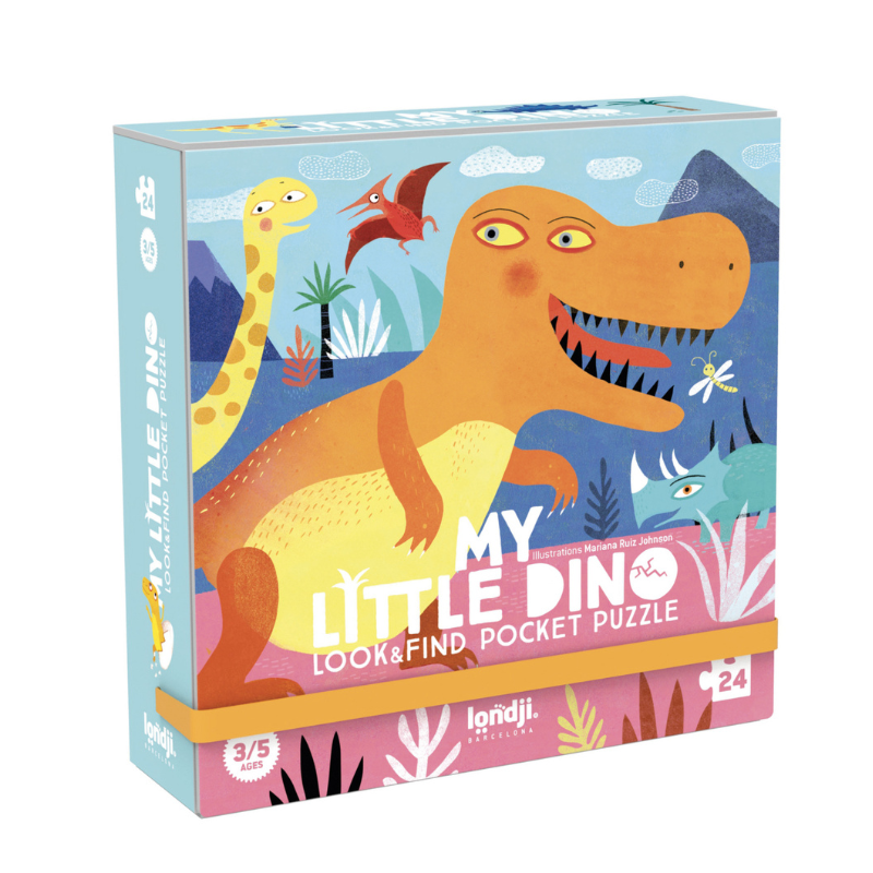 Für unterwegs: Wunderschön illustriertes Pocket Puzzle 'My Little Dino' von Londji. Willkommen in Londjis Jurassic-Welt! der freundliche T-Rex öffnet dir die Tür zu einer fantastischen Welt, in der Triceratops, Diplodocus und Pterodactylus dich spazieren führen. Das tolle 24-teilge Puzzle im Taschenformat und Beobachtungsspiel bereitet Kids ab 3 Jahren viel Freude und Spaß und fördert gleichzeitig die Konzentration und den Blick für Details. In der stabilen Box lässt sich das Puzzle wunderbar verstauen und natürlich transportieren.