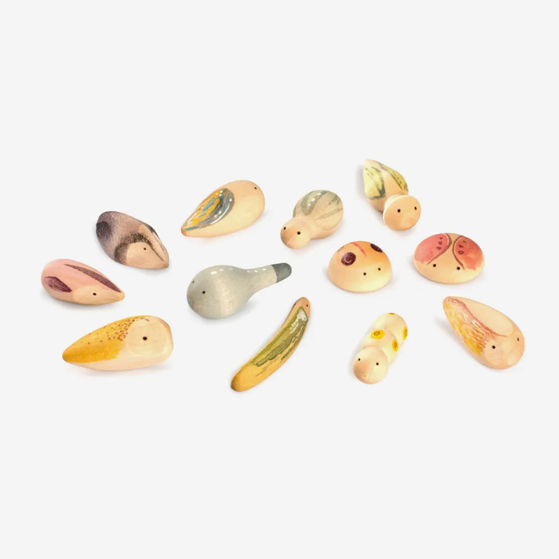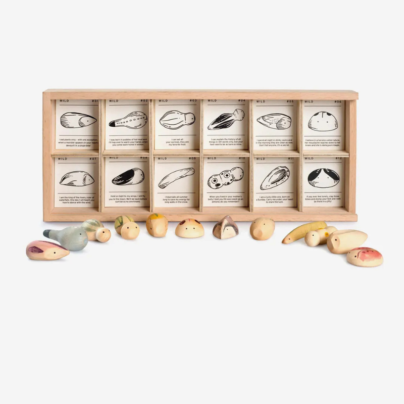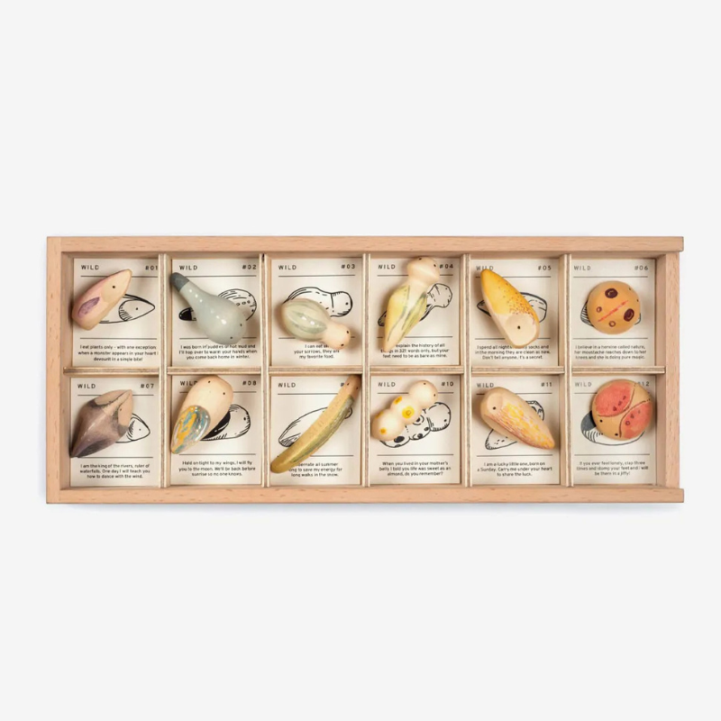 Mit „Wild“ bringt Grapat den Zauber des Waldes direkt ins Kinderzimmer. Das Set besteht aus zwölf naturinspirierten Holzfiguren – mal glatt, mal kantig, mal rund, mal rau. So entsteht eine kleine Sammlung wilder Formen, die Kinder nach Lust und Laune entdecken, sortieren, stapeln und bespielen können.